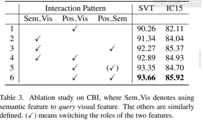 While applying to the semantic branch, it models the semantic affinities between previous decoded characters and current positional clue. CBI-S.