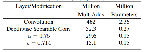 MobileNets는 3 * 3 깊이 분리형 컨볼 루션을 사용하므로 표준 컨볼 루션을 사용하는 것보다 계산량이 8-9 배 감소합니다.