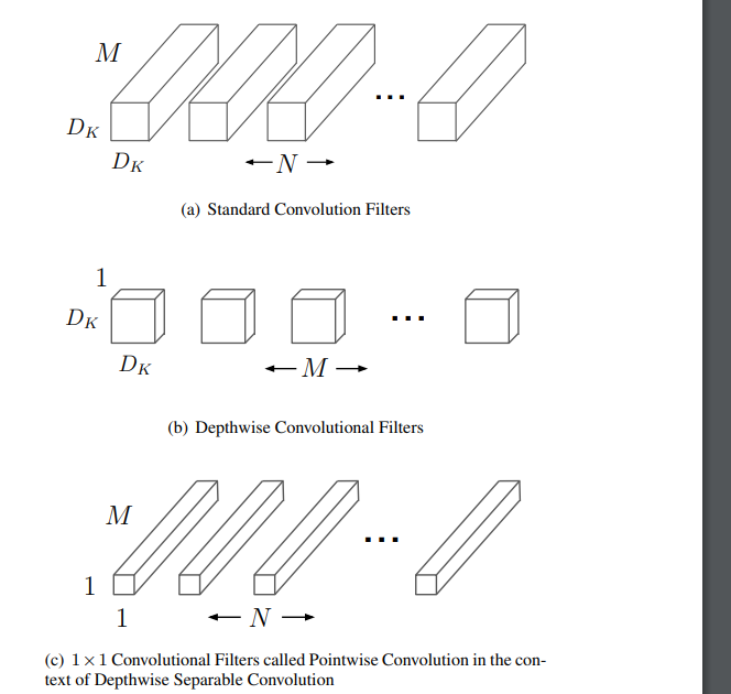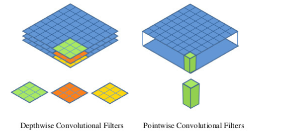 MobileNet 모델은 표준 회선을 깊이 별 회선과 1 * 1 회선, 1 * 1 회선으로 분해하는 분해 된 회선의 한 형태 인 깊이 별 분리 가능한 회선을 기반으로합니다. pointwise convolution이라고도합니다. MobileNet의 경우 딥 컨볼 루션은 각 채널에 컨볼 루션 커널을 적용합니다. 그런 다음 점별 컨볼 루션은 1 * 1 컨볼 루션을 적용하여 출력 및 깊이 컨볼 루션을 결합합니다. 표준 컨볼 루션은 컨볼 루션 커널과 입력을 한 번에 새 출력으로 결합합니다. 깊이 분리 가능한 컨볼 루션은 필터링을위한 레이어와 결합을위한 레이어의 두 레이어로 나눕니다. 이 분해 프로세스는 계산량과 모델 크기를 크게 줄입니다.Figure 2 shows how a standard convolution 2(a) is factorized into a depthwise convolution 2(b) and a 1 × 1 pointwise convolution 2(c).
