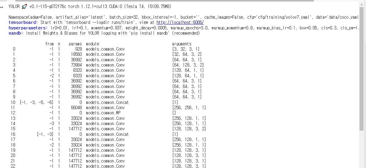 !python train.py --workers 8 --epochs 1 --device 0 --batch-size 32 --data data/coco.yaml --img 640 640 --cfg cfg/training/yolov7.yaml --weights '' --name yolov7 --hyp data/hyp.scratch.p5.yaml