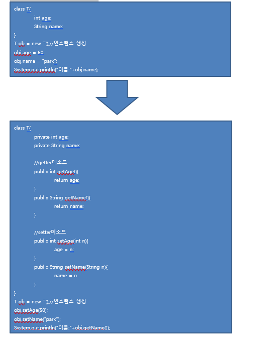=>객체 지향 프로그래밍에서는 인스턴스 변수에 인스턴스(객체)가 직접 접근하는 것을 권장하지 않습니다.