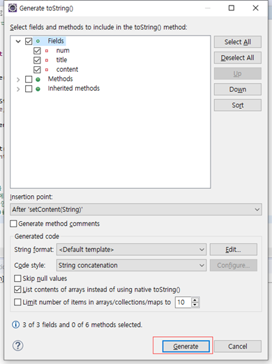 //오른쪽 마우스 클릭 ->Source ->Generate getters and setters ->select All -> Generate