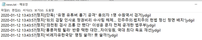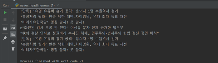 #naver_headlinenews.py import urllib.request import bs4 import time import os while True: url = "https://news.naver.com/" html = urllib.request.urlopen(url) bs_obj = bs4.BeautifulSoup(html, "html.parser")