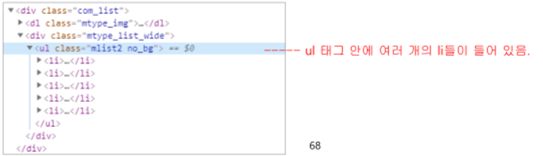 bs_obj = bs4.BeautifulSoup(html, "html.parser") #print(bs_obj) mlist2_no_bg = bs_obj.find("ul", {"class": "mlist2 no_bg"}) #bs_obj에서 class가 ‘mlist2 no_bg’ 인 ul 태그를 찾음 #print(mlist2_no_bg) lis = mlist2_no_bg.findAll("li") #lis 변수를 선언하고, ‘mlist2 no_bg’ 에서 li 태그들을 #리스트[ ] 형태로 담으라는 명령 for li in lis:# for 문을 이용해 lis에 있는 li들을 하나씩 꺼내서 출력 print(li)