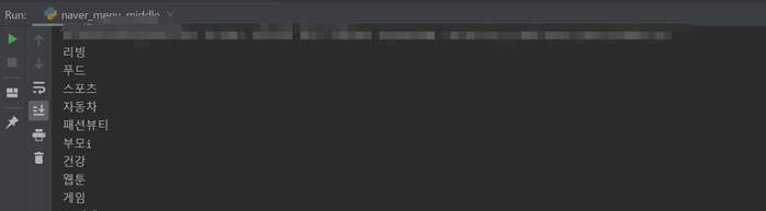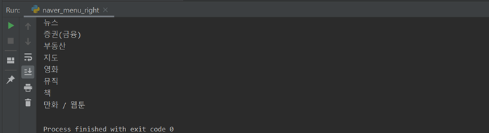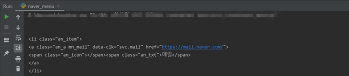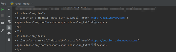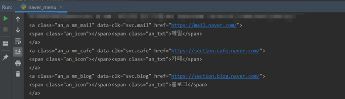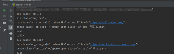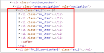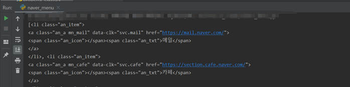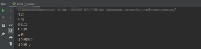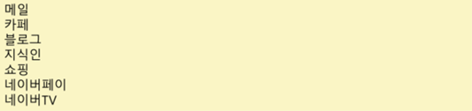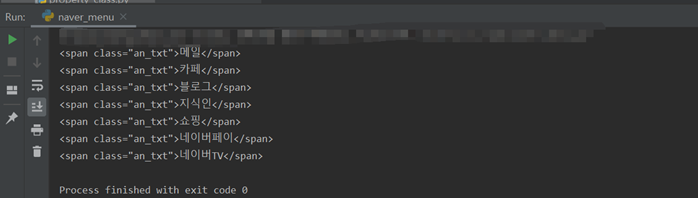 bs_obj = bs4.BeautifulSoup(html, "html.parser") ul = bs_obj.find("ul", {"id": "PM_ID_serviceNavi"}) lis = ul.findAll("li") #print(lis) for i in range(0, len(lis)): a_tag = lis[i].find("a") span_tag = a_tag.find("span", {"class": "an_txt"}) print(span_tag.text)