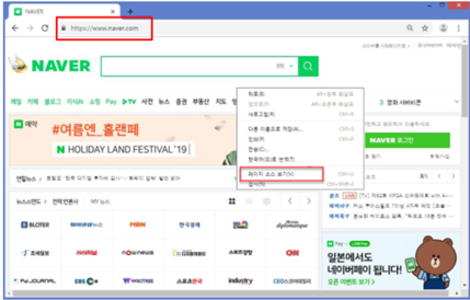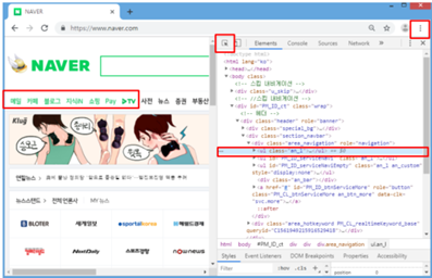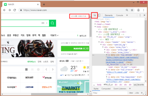 ‘네이버를 시작페이지로’ 버튼을 마우스로 찾은 후에 클릭하면, HTML 소스코드에서 어떤 부분인지 표시를 해줌.