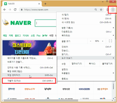 크롬을 켜고 우측 상단에 ···버튼을 눌러서 [도구 더보기 → 개발자 도구]