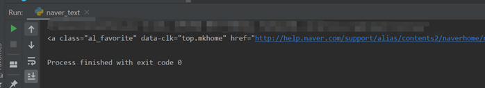 url = "https://www.naver.com" html = urllib.request.urlopen(url) #html이라는 변수 안에 텍스트 형식으로 네이버 첫 #페이지를 호출한 데이터가 문자열 형태로 들어감 #print(html.read()) bs_obj = bs4.BeautifulSoup(html,"html.parser")# bs_obj에는 전체 소스가 들어 있음 #print(bs_obj) top_right = bs_obj.find("div",{"class":"area_links"}) #div 태그 중에서class가 “area_links”로 되어있는 div를 찾으라는 명령 #print(top_right) first_a = top_right.find("a")#첫 번째 나오는 a태그를 찾음 print(first_a)# a태그 안에 있는 text만 뽑아냄