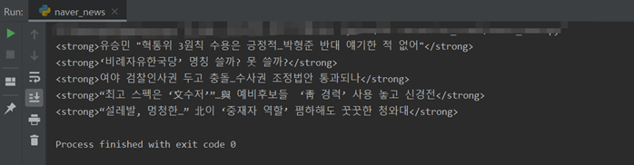 bs_obj = bs4.BeautifulSoup(html, "html.parser") #print(bs_obj) mlist2_no_bg = bs_obj.find("ul", {"class": "mlist2 no_bg"}) #bs_obj에서 class가 ‘mlist2 no_bg’ 인 ul 태그를 찾음 #print(mlist2_no_bg) lis = mlist2_no_bg.findAll("li") #lis 변수를 선언하고, ‘mlist2 no_bg’ 에서 li 태그들을 #리스트[ ] 형태로 담으라는 명령 for li in lis:# for 문을 이용해 lis에 있는 li들을 하나씩 꺼내서 출력 #print(li) strong = li.find("strong") print(strong)