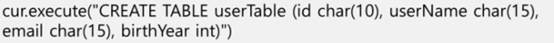 cur.execute("DROP TABLE news")#테이블 있으면 삭제하고 해야 한다. #위에것 최초생성시 주석 처리한다. cur.execute("CREATE TABLE news (div char(10), title char(100), writer char(10))")