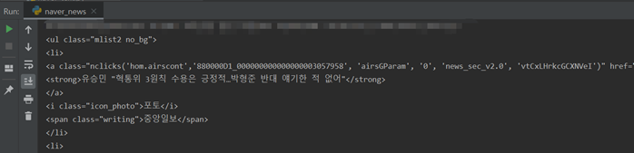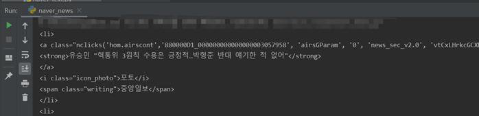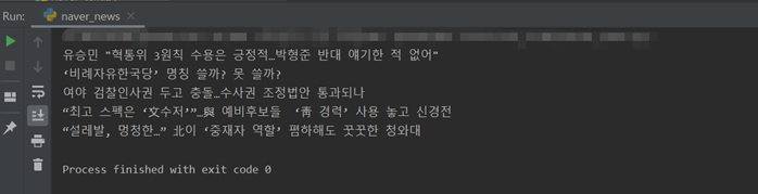 ul = bs_obj.find("ul", {"class": "hdline_article_list"}) div = ul.findAll("div", {"class": "hdline_article_tit"})