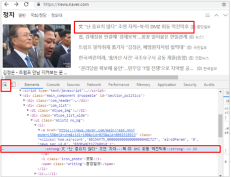 원하는 데이터 HTML상에 어디에 있는지 찾기 위해서는 구글 크롬의 ‘개발자 도구’를 이용함.