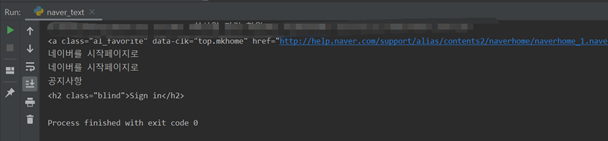 url = "https://www.naver.com" html = urllib.request.urlopen(url) #html이라는 변수 안에 텍스트 형식으로 네이버 첫 #페이지를 호출한 데이터가 문자열 형태로 들어감 #print(html.read()) bs_obj = bs4.BeautifulSoup(html,"html.parser")# bs_obj에는 전체 소스가 들어 있음 #print(bs_obj) top_right = bs_obj.find("div",{"class":"area_links"}) #div 태그 중에서class가 “area_links”로 되어있는 div를 찾으라는 명령 #print(top_right) first_a = top_right.find("a")#첫 번째 나오는 a태그를 찾음 print(first_a)# a태그 안에 있는 text만 뽑아냄 print(first_a.text)