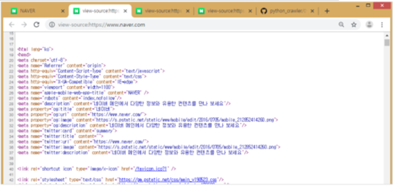 url = "https://www.naver.com" html = urllib.request.urlopen(url) #html이라는 변수 안에 텍스트 형식으로 네이버 첫 #페이지를 호출한 데이터가 문자열 형태로 들어감 print(html.read())